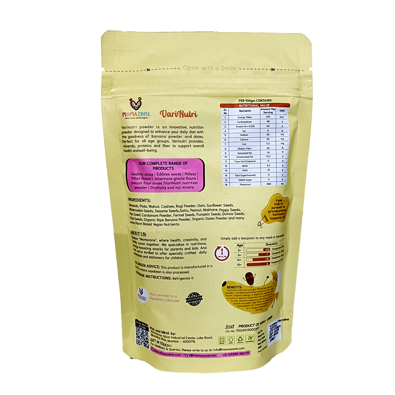 - Almonds, Pista, Walnut, Cashew, Ragi , Oats, Sunflower Seeds, Watermelon Seeds, Sesame Seeds, Sattu, Peanut, Makhane, Poppy Seeds, Flaxseed, Cardamom Powder, Cinnamon Powder, Fennel Seeds, Pumpkin Seeds, Quiona Seeds, Chia Seeds & Many Plant Based Vegan Nutreints Enriched With Vitamins And Minerals, Ripe Banana Powder, Dates Powder